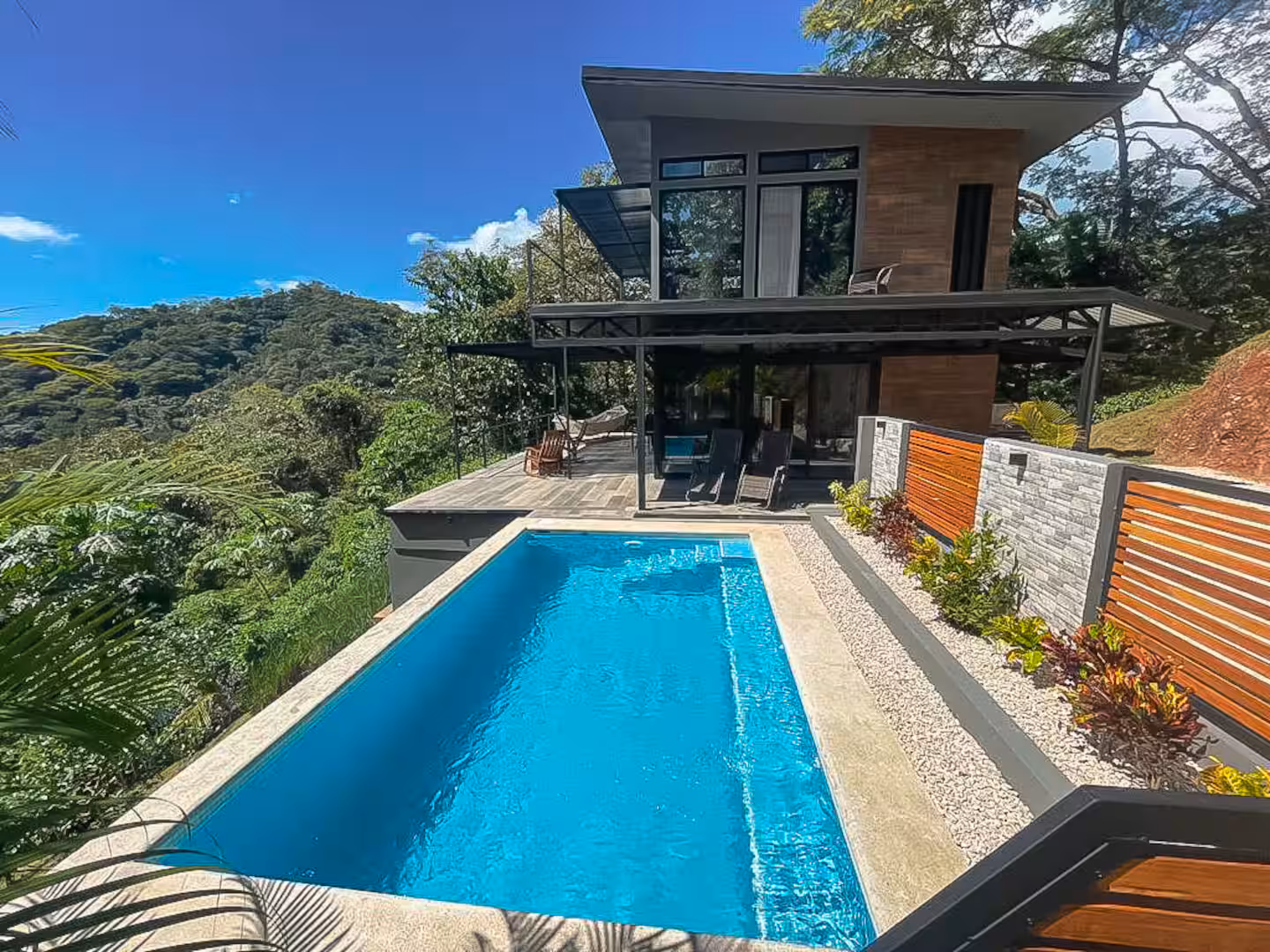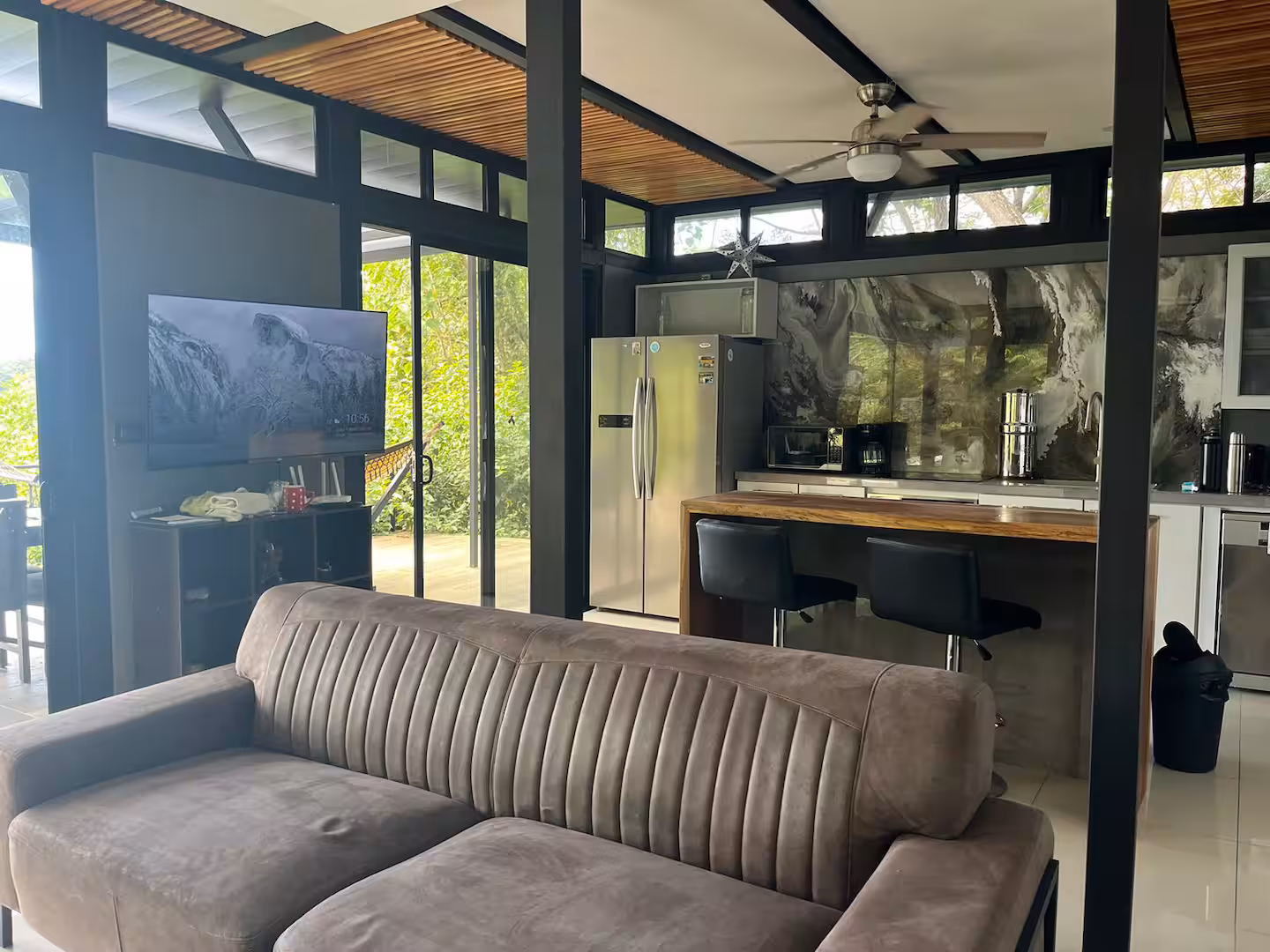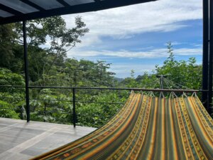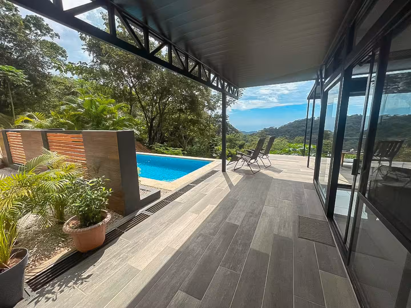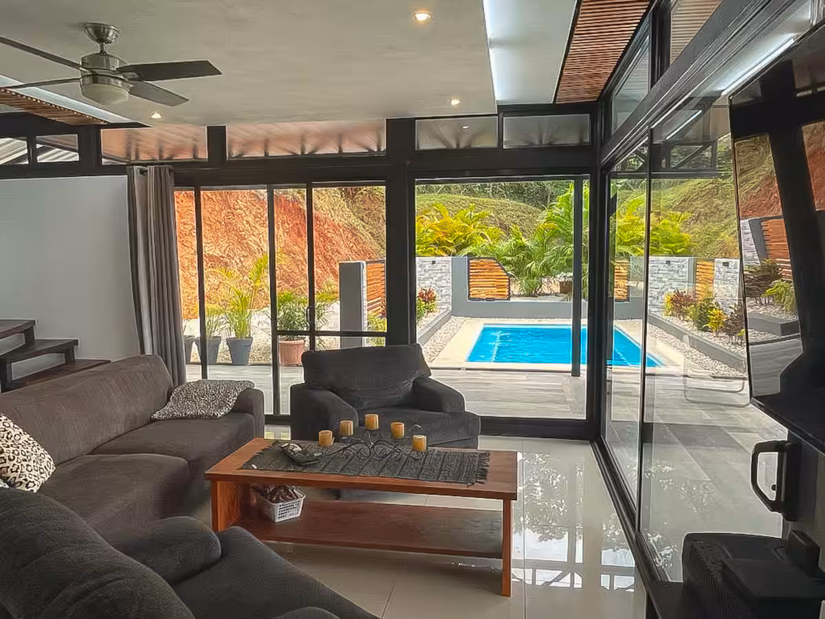 This house boasts panoramic views that seamlessly blend nature's finest elements. With each glance outside, residents are reminded of the captivating beauty that surrounds them. It's located up in the hills, only a 10 minute drive away from Carrillo or Sámara beach.